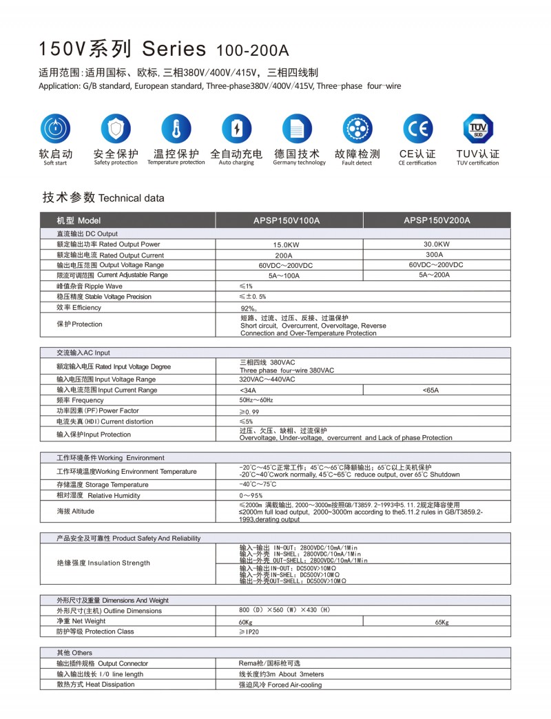 觸摸屏智能操作設(shè)計:告別傳統(tǒng)按鍵方式,給您帶來更現(xiàn)代更具科技智能的操作體驗 自動充電:插槍自動充電,簡化充電流程,便于操作 兼容性高:80V200A兼容48V200A充電 多重保護: 輸出短路,過流過壓保護,反接保護,電流導(dǎo)管保護等多重保護 預(yù)約充電功能:避開高峰用電時段,有效節(jié)省成本 雙語切換:中英文雙語隨需切換,跨越語言障礙,與世界接軌 人性化設(shè)計:充電機背板內(nèi)部附部件明細(xì)及產(chǎn)品接線圖,方便客戶可更清楚的了解產(chǎn)品,便于維修,提高售后時效 獨特設(shè)計: 內(nèi)置電磁鎖驅(qū)動模塊,防止臨時斷電鎖槍 使用壽命更長:功率模塊預(yù)留20%空間,提高模塊的使用壽命 出色內(nèi)部結(jié)構(gòu): 內(nèi)部結(jié)構(gòu)左右出風(fēng),內(nèi)部電路不容易積粉塵,提高充電機壽命