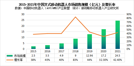 圖表:2015-2021年中國叉式移動(dòng)機(jī)器人市場(chǎng)銷售規(guī)模(億元)及增長率