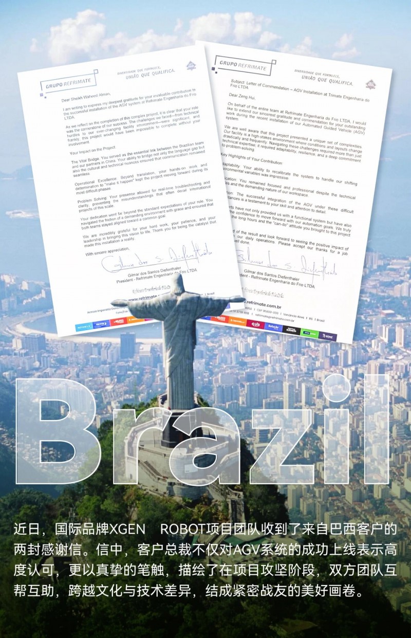 這兩封來(lái)自巴西項(xiàng)目的感謝信,不僅是對(duì)一次技術(shù)交付的肯定,更是對(duì)公司“以客戶為中心”服務(wù)模式的信任背書(shū),是XGEN ROBOT在全球智慧物流領(lǐng)域深耕的縮影。未來(lái),XGEN ROBOT將以更專業(yè)的技術(shù)支持、更深度的客戶協(xié)同和更細(xì)致的價(jià)值陪伴,在全球范圍內(nèi),書(shū)寫(xiě)一個(gè)又一個(gè)關(guān)于信任、挑戰(zhàn)與共贏的故事。