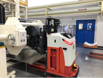 針對電芯中段工藝分切至卷繞/疊片這部分的極卷搬運場景,佳順智能開發(fā)了單懸臂AGV,最大負載850KG,結(jié)合激光測距和二維碼技術(shù)進行精確定位,擁有360°避障雷達、急停按鈕、機械防撞機構(gòu)、聲光報警等多種避障功能,實現(xiàn)生產(chǎn)安全、穩(wěn)定運行。
