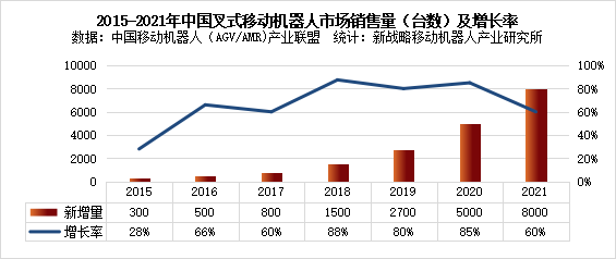 據(jù)中國移動(dòng)機(jī)器人(AGV/AMR)產(chǎn)業(yè)聯(lián)盟數(shù)據(jù)、新戰(zhàn)略移動(dòng)機(jī)器人產(chǎn)業(yè)研究所統(tǒng)計(jì),2021年中國叉式移動(dòng)機(jī)器人(含視覺導(dǎo)航)銷量達(dá)8000臺(tái),同比增長60%,市場規(guī)模約為24.5億元,同比增長42.40%。