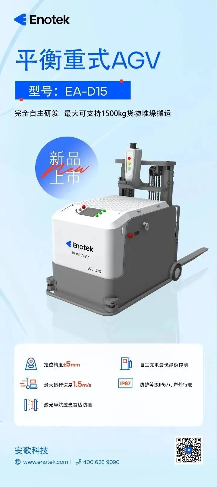 平衡重式AGV EA-D15繼承了傳統平衡重式叉車的各項優勢,并憑借“智慧大腦”賦能,實現更可靠的穩定性、更靈活的柔性、更智能的組合方式。新一代的AGV EA-D15具有額定1500kg的載荷能力、1.5m/s的運行速度,同時配置了SLAM激光導航、激光避障等技術,進一步提升了定位的精確度與穩定性,無人化操作杜絕了安全生產事故的發生,更助力企業實現降本增效,可廣泛適用于原料運輸,托盤運輸,產成品運輸,裝配工序,特殊場景運輸等場景。