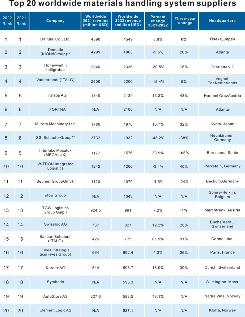 大福仍然以 45.4 億美元的年銷售額位居榜單第一,高于 2021年的  43.9 億美元收入。大福將其持續(xù)增長歸功于上一年的大量訂單積壓、對(duì)半導(dǎo)體制造商的強(qiáng)勁銷售、零售和電子商務(wù)部門系統(tǒng)的擴(kuò)展以及服務(wù)收入的提高。