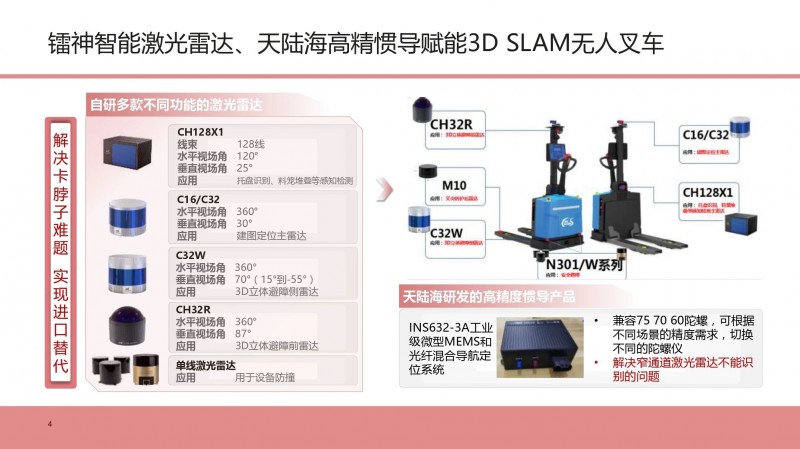 在論壇分享會上介紹了無人叉車配置的技術(shù)領(lǐng)先全球的鐳神智能激光雷達(dá)系列產(chǎn)品,解決了卡脖子難題,實現(xiàn)國產(chǎn)化自主可控,每臺無人叉車周身配置7-8顆激光雷達(dá),提供豐富穩(wěn)定的全方位立體感知信息,做到更安全、更穩(wěn)定、更可靠。