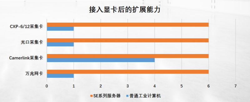 應對需要同時處理多張采集卡數據的應用時,由于傳統工控機自身擴展槽數量和顯卡厚度等因素限制,未能滿足需要的擴展性能;而SE系列服務器其特有的多卡插槽特性和獨特槽位設計,能夠在規避顯卡遮擋的同時提供至多擴展6個PCIex8卡槽的采集卡。