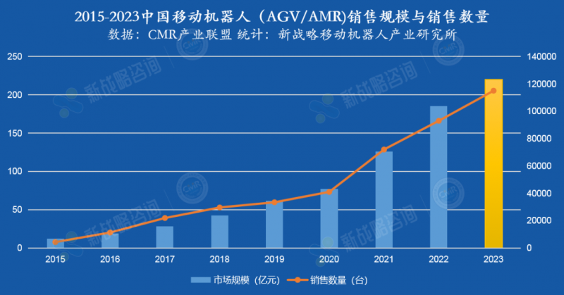 根據(jù)新戰(zhàn)略移動(dòng)機(jī)器人產(chǎn)業(yè)研究所初步測(cè)算,預(yù)計(jì)2023年中國(guó)移動(dòng)機(jī)器人(AGV/AMR)銷售規(guī)模約為220億,同比增長(zhǎng)18.9%;銷售數(shù)量約為115000臺(tái),同比增長(zhǎng)23.7%。