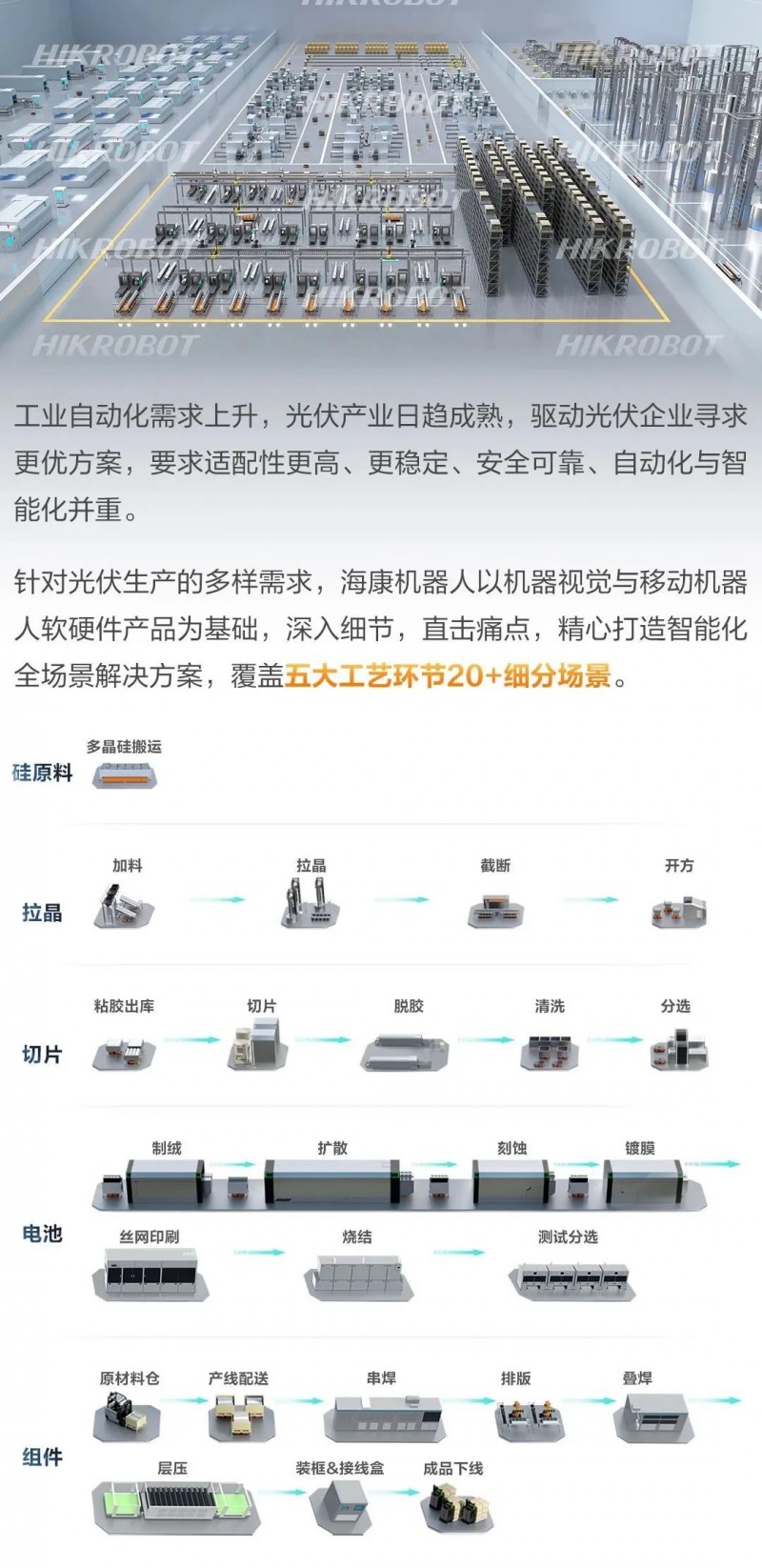 海康機器人深耕光伏行業,在解決方案落地應用過程中積累了豐富的經驗。為更好地滿足客戶多元化需求,海康機器人一方面對原有機器視覺和移動機器人軟硬件產品進行迭代升級,一方面持續定制化開發新產品,不斷豐富產品矩陣,提供一站式服務。