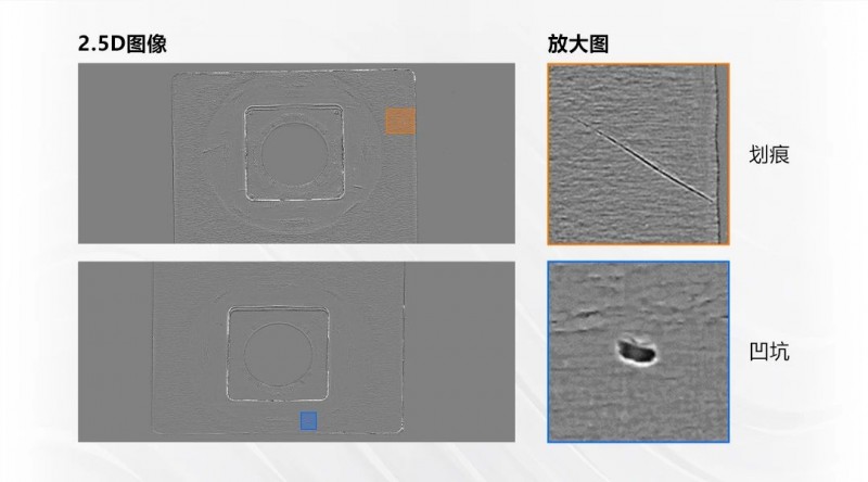 檢測(cè)效果:去除表面反光和臟污影響,將有深度變化的缺陷突出;根據(jù)臟污與樣品表面的反射特性不同突出臟污缺陷,同時(shí)與凹凸等缺陷進(jìn)行區(qū)分
