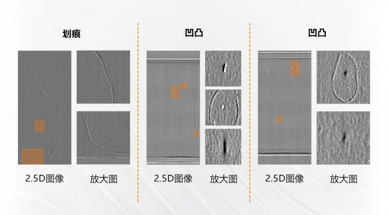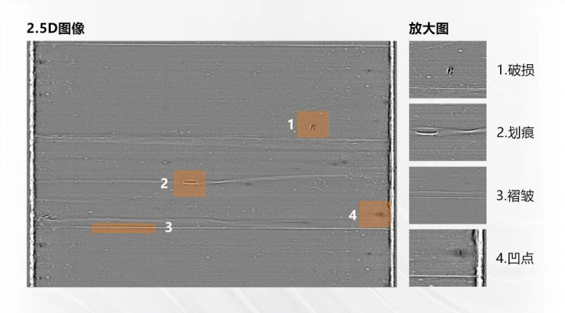 檢測(cè)效果:去除覆膜表面顏色和反光影響,有效檢出微小缺陷,對(duì)有無高度變化的缺陷進(jìn)行區(qū)分