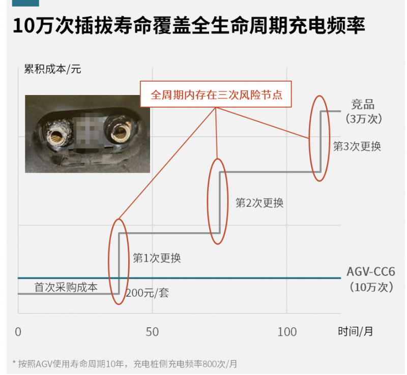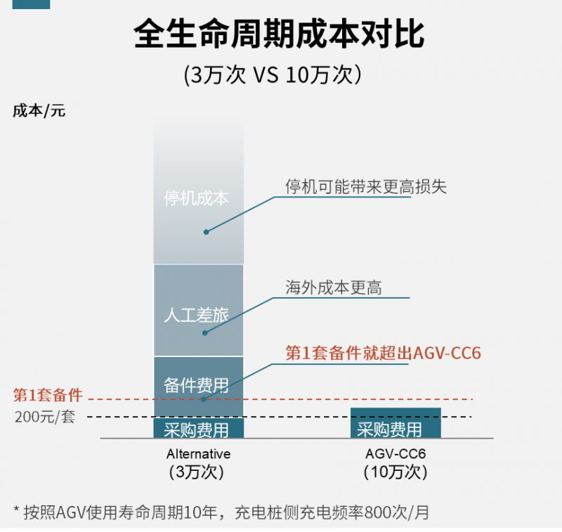 在移動機器人的全生命周期內,與3萬次插拔壽命的連接器相比,史陶比爾AGV-CC6連接器憑借高達10萬次的插拔壽命,展現出了更為顯著的成本效益。具體而言,使用 AGV-CC6,10年內僅需承擔首次采購成本;競品更換第一套備件后,累積成本就已遠超AGV-CC6,還不包括其產生的大量人工成本和生產停機成本。此外,史陶比爾也在持續推進本地化降本,使得AGV-CC6性價比更具優勢。
