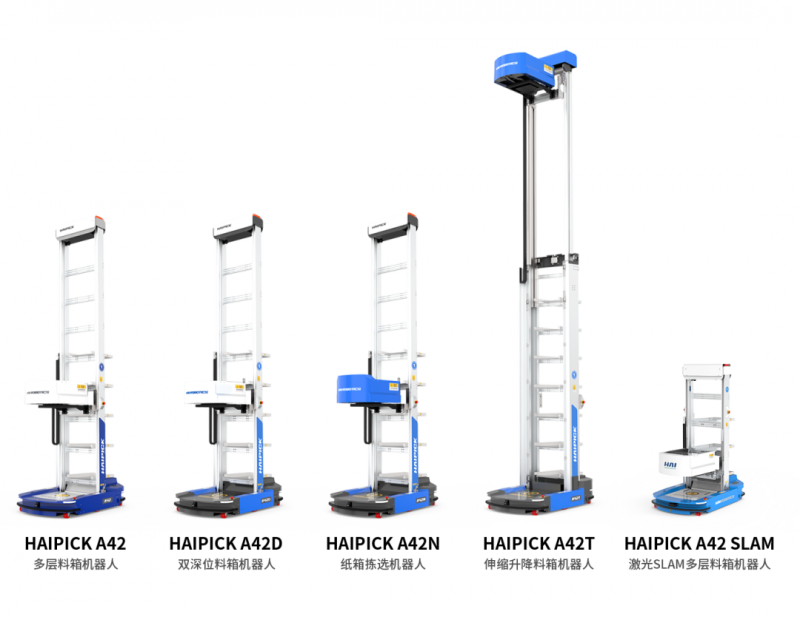 2020年,庫寶機器人從料箱機器人發(fā)展為箱式倉儲機器人系列產(chǎn)品,衍生出 HAIPICK A42(多層料箱機器人)、HAIPICK A42D(雙深位料箱機器人)、HAIPICK A42N(紙箱揀選機器人)、HAIPICK A42T(伸縮升降料箱機器人)、HAIPICK A42 SLAM(激光SLAM料箱機器人),針對客戶使用場景,提供全方位、定制化的解決方案。