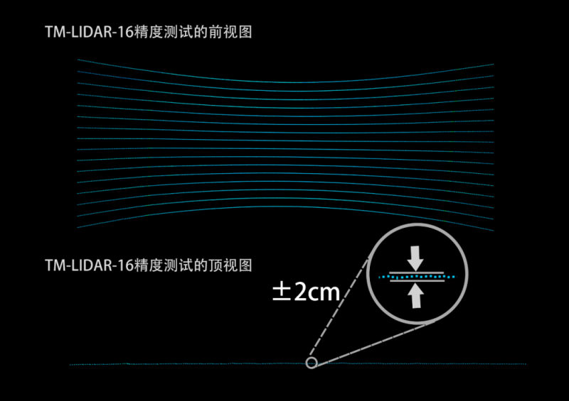 TM-LIDAR-16采用脈沖測距法,能抗強光干擾,且誤差大小受量程影響較小,在150米以內,墻面精度控制在±2cm。