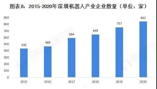 近年來(lái),深圳機(jī)器人產(chǎn)業(yè)規(guī)模愈發(fā)龐大,2020年深圳市機(jī)器人產(chǎn)業(yè)總產(chǎn)值為1434億元,較2019年的1257億元增長(zhǎng)14.08%,產(chǎn)值增速顯著回升,回歸發(fā)展快車道。深圳市機(jī)器人企業(yè)總數(shù)量達(dá)842家,較2019年的757家增長(zhǎng)11.23%。