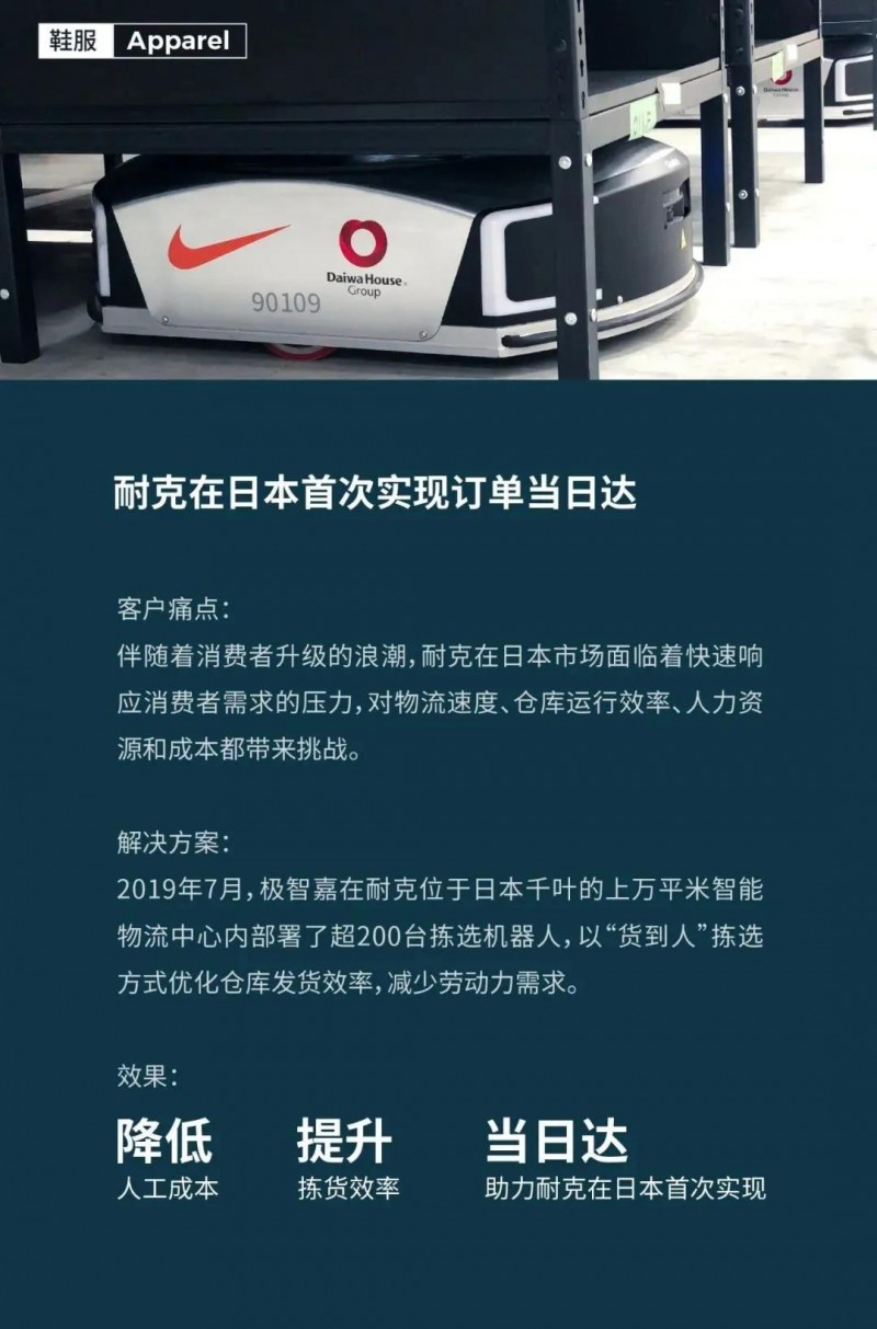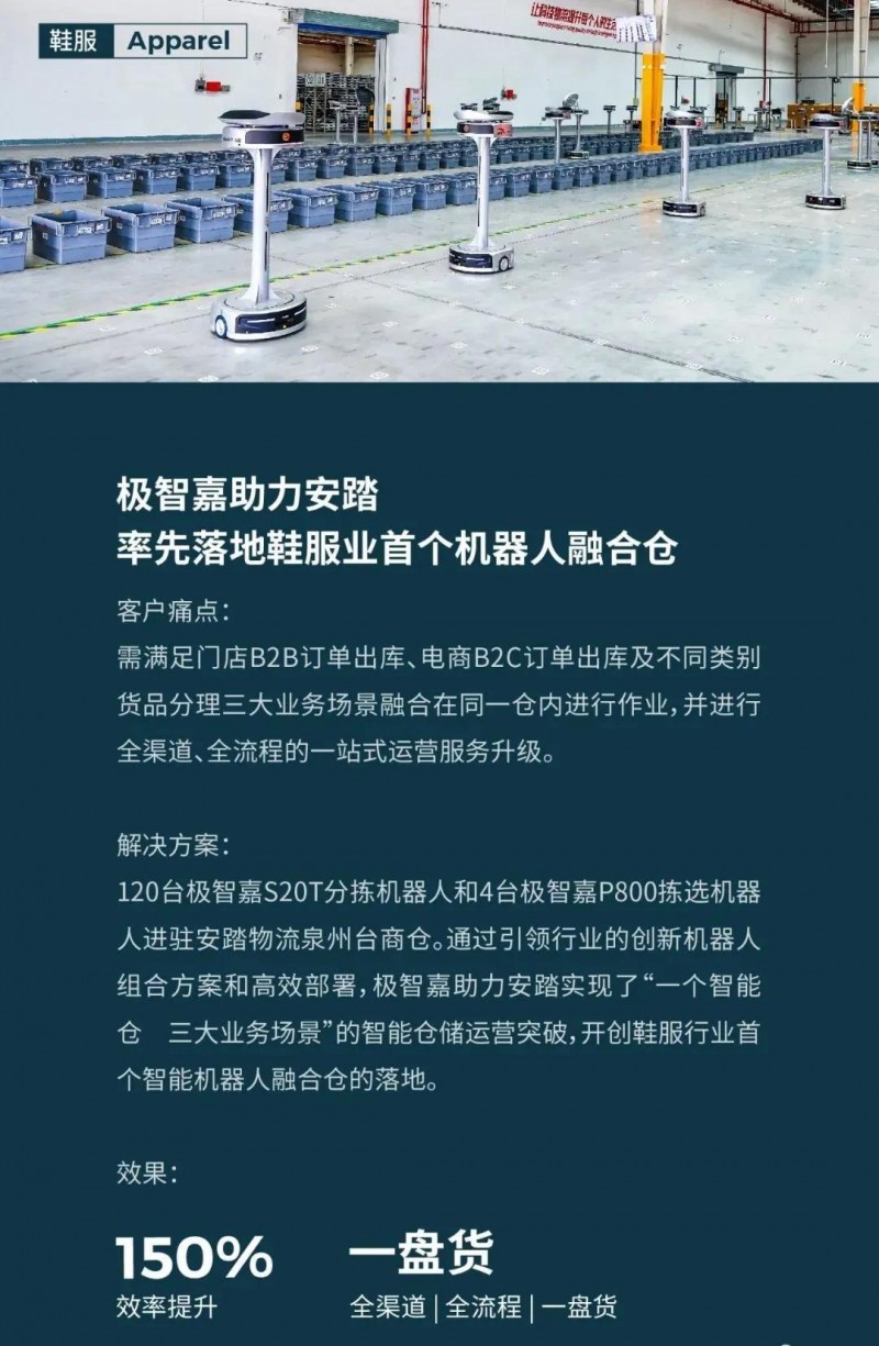 作為在鞋服行業擁有深厚行業積淀的智能物流方案專家,極智嘉已成功賦能耐克、安踏等行業龍頭品牌,實現物流智能升級,不斷助力客戶以數字化、精細化的倉配運營管理,連接碎片化、多邊化場景,提升消費者購物體驗。