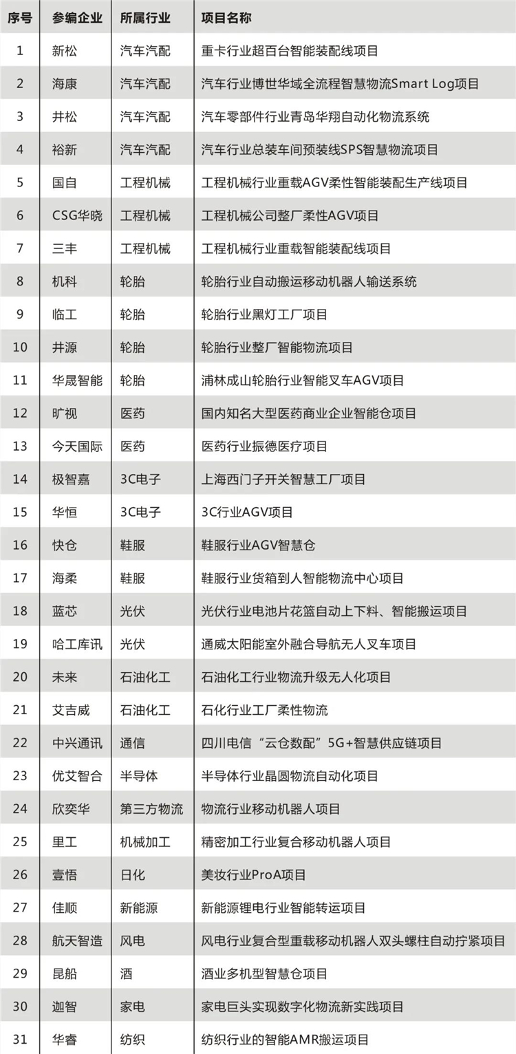 該合集甄選了31家企業31個經典案例,涵蓋了汽車汽配、工程機械、第三方物流、3C電子、醫藥醫療等眾多行業,無論是產品的創新度還是技術實力都有較高的代表性,是中國工業應用移動機器人經典之作,具體入選案例名錄如下: