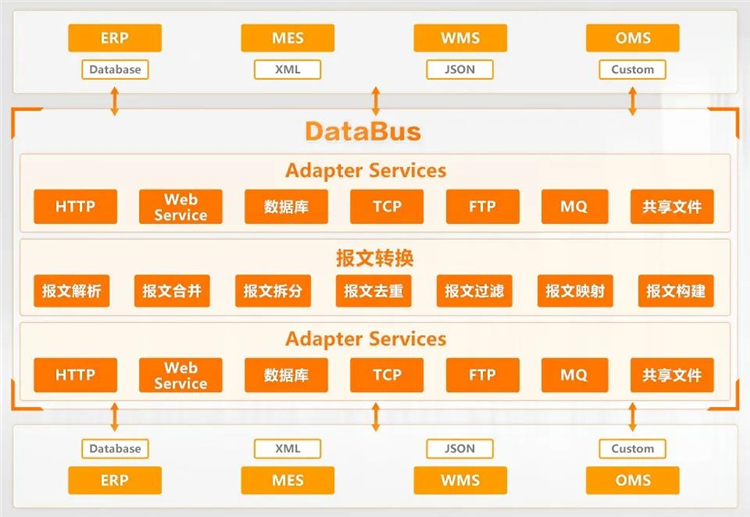 DataBus提供多個業(yè)務(wù)系統(tǒng)之間數(shù)據(jù)交互能力,支持HTTP/HTTPS/WebService/數(shù)據(jù)庫中間表/FTP/共享文件夾等多種通訊方式,支持JSON/XML等多種報文格式。