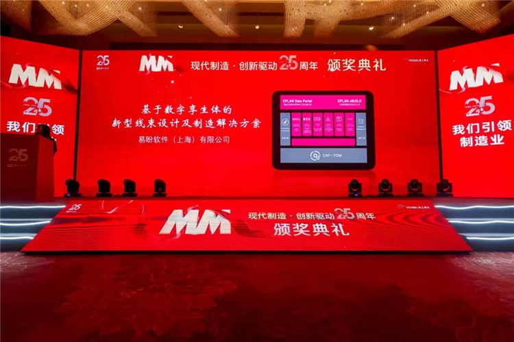 EPLAN大中華區總裁覃政先生獲得杰出人物獎,EPLAN憑借“基于數字孿生體的新型線束設計及制造解決方案”獲得智能化解決方案獎。