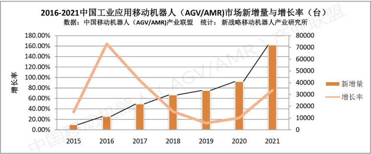 圖表:2016-2021中國市場工業(yè)應(yīng)用移動機器人(AGV/AMR)新增量(臺)與增長率