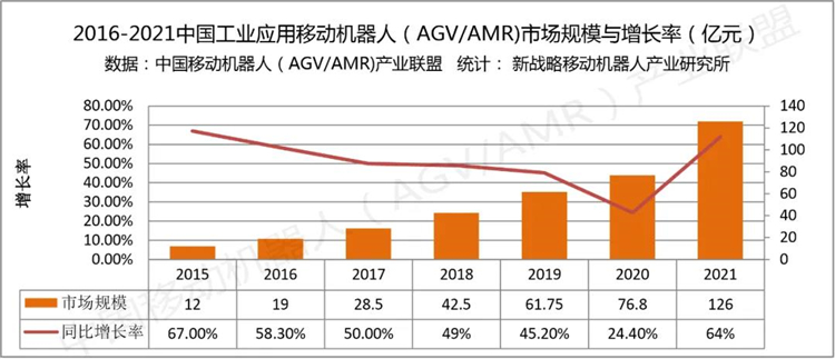 圖表:2016-2021中國工業(yè)應(yīng)用移動機器人(AGV/AMR)市場規(guī)模(億元)與增長率