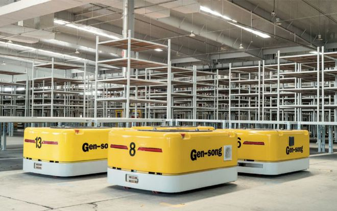 合肥井松為上汽通用東岳打造的倉儲項目,整個倉庫共有貨架956個,每個貨架5層,可以存放料箱34416個,貨物種類與吞吐流量極為龐大。井松為倉庫布置了21臺視覺紋理導航機器人來實現整個倉庫的自動化搬運,通過中央調度系統進行智能分析,合理調配每一臺機器人完成各種物料的進出。