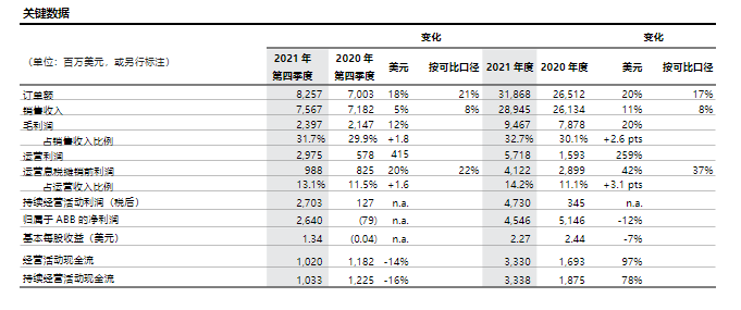 根據ABB發(fā)布的2021年第四季度及全年財報顯示,2021年全年,ABB訂單總額為319億美元,同比增長20%,按可比口徑增長17%;銷售收入為289億美元,同比增長11%,按可比口徑增長8%;運營利潤為57.18美元,利潤率為19.8%。