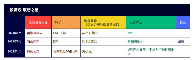 近兩年,聯(lián)想之星在工業(yè)移動機(jī)器人領(lǐng)域投資了三家企業(yè),包括箱式倉儲機(jī)器人科技企業(yè)海柔創(chuàng)新、機(jī)器人通用底盤松靈機(jī)器人、AMR機(jī)器人公司姜歌機(jī)器人,基本上都是從天使輪開始切入。